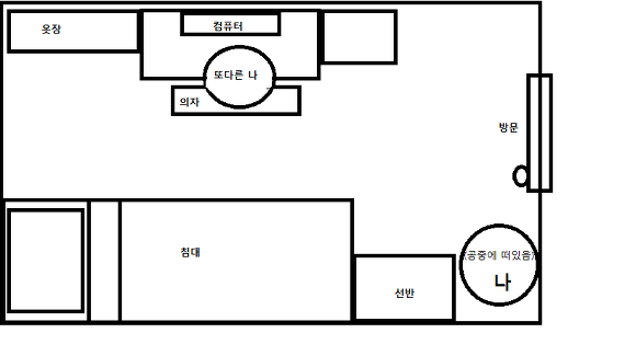 내방은 대충 이런 구조고 나랑 '나와 똑같이 생긴 나' 는 각자 자리에서 한동안 움직이지 않았어.