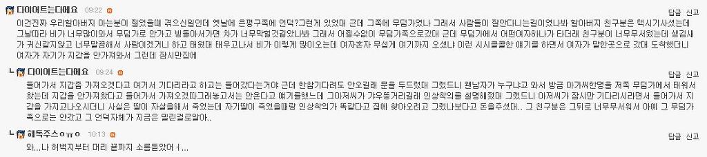 할아버지 친구분은 택시기사셨는데 그 날 따라 비가 너무 많이 와서 무덤가로 안가고 빙 돌아서가면 차가 너무 막힐 것 같았나봐.