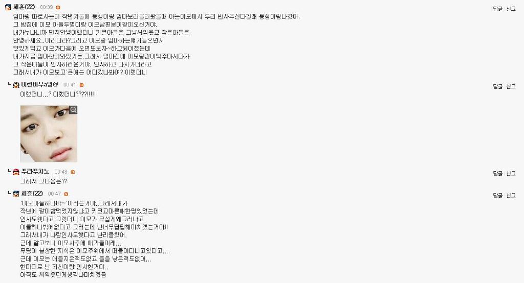 모배) 엄마랑 따로 사는데 작년 겨울에 동생이랑 엄마보러 올라갔을 때 아는 이모께서 우리 밥 사주신다길래 동생이랑 나갔어.