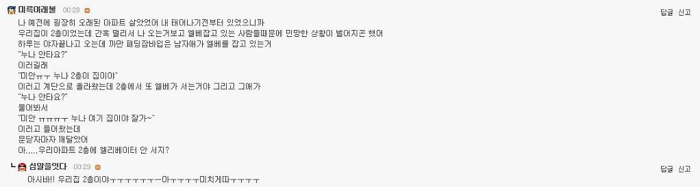 우리집이 2층이었는데 간혹 멀리서 나 오는거 보고 엘베잡고 있는 사람들 때문에 민망한 상황이 벌어지곤 했어.