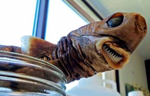 이 날카로운 이빨로 먹이를 물고, 몸을 한바퀴 돌려서 살점을 떼어먹는대