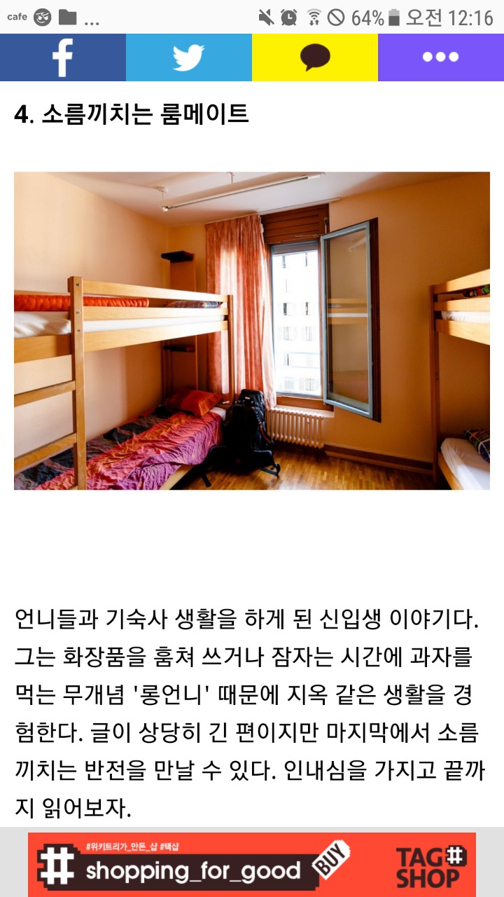 답댓글 작성자도라미💕 작성시간 18.02.25 룸메글이 제일 무서워 ㅠㅠ 저거 여시에 올라왔던 글인데