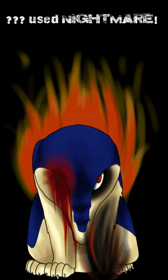 브케인은 겉으로 보기에는 멀쩡했지만, 레벨이 딱 5에 HP는 1밖에 남아 있지 않았고, 공격도 두 개밖에 없었다. 째려보기와 플래시였다. 나는 왜 그 사람이 포켓몬 이름을 ‘HURRY'라고 지었는지 알 수가 없었지만, 그 당시에는 별 신경을 쓰지 않고 무시했다. 제일 으스스한 것은 내 게임보이 볼륨이 최대로 맞춰져 있었는데도, 내가 포켓몬 정보를 확인하는 동안 아무도 울음소리를 내지 않았다는 것이다. 그냥 침묵뿐이었다.