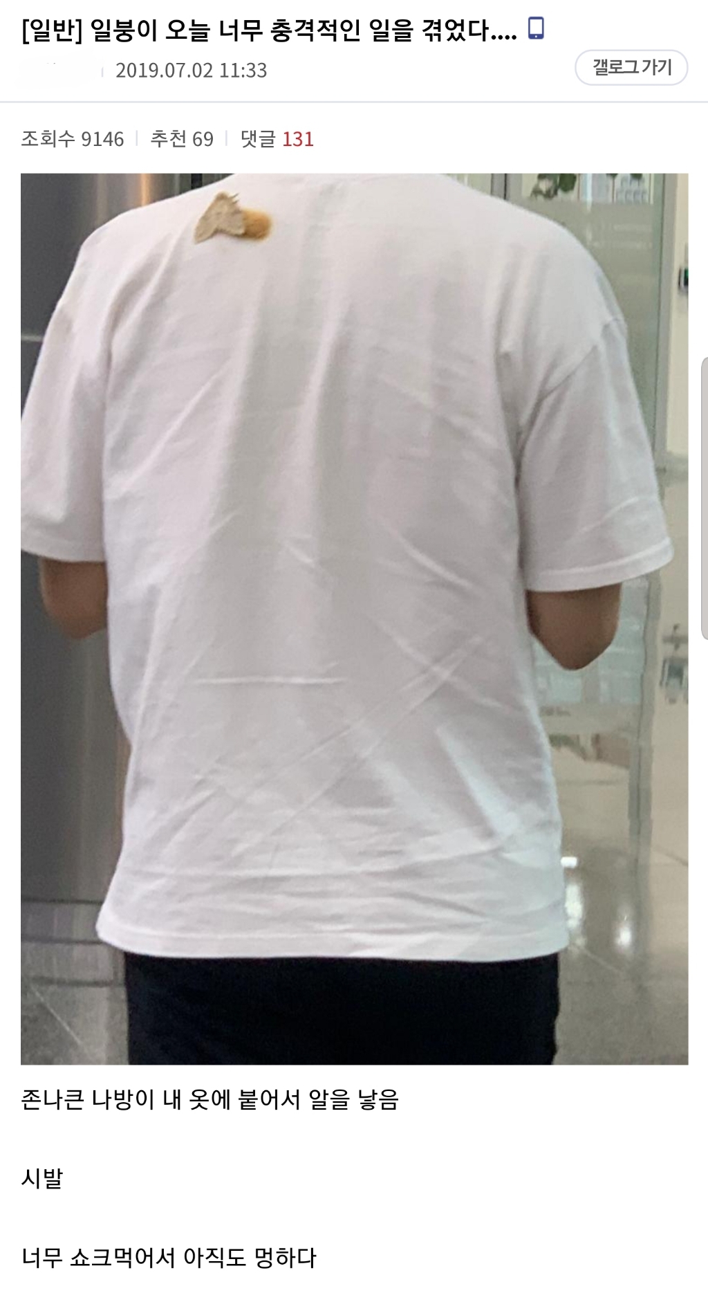 [징글돋음](혐) 나방때문에 쇼크먹은 디시인....jpg 작성자머쓱타드|작성시간19.07.22|조회수15,076 목록 댓글 68 글자크기 작게가 글자크기 크게가 출처 : 여성시대 머쓱타드혐주의 다음검색 현재 게시글 추가 기능 열기 북마크 공유하기 신고 센터로 신고 댓글 댓글 68 댓글쓰기 답글쓰기 댓글 리스트 작성자벌써 드릉드릉한다 | 작성시간 19.07.25 으 미친 으악 작성자난존나짱쎄니까 | 작성시간 19.07.25 시발새끼 옷 버려ㅠㅠㅠㅠ 작성자집에가고십다십알거 | 작성시간 19.07.26 시발 나같으면 그자리에서 옷벗는다;;;;;;;;;;;;;; 작성자나는에리입니다귀여운감자 | 작성시간 19.07.26 아개세발 작성자눈썹다밀어버린다 | 작성시간 19.07.27 아근데 나 싸팬가 한남이 충격먹었다하니까 왤케 웃기냐ㅋㅋㅋㅋ 댓글 전체보기