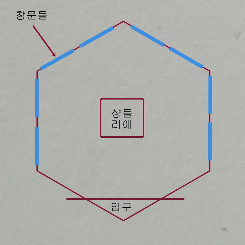 응접실은 육각형 모양에 각 면마다 창문이 여러개 달려있고, 높이가 높기 때문에 창문이 위아래로 달려있는, 창문이 굉장히 많은 방이에요.