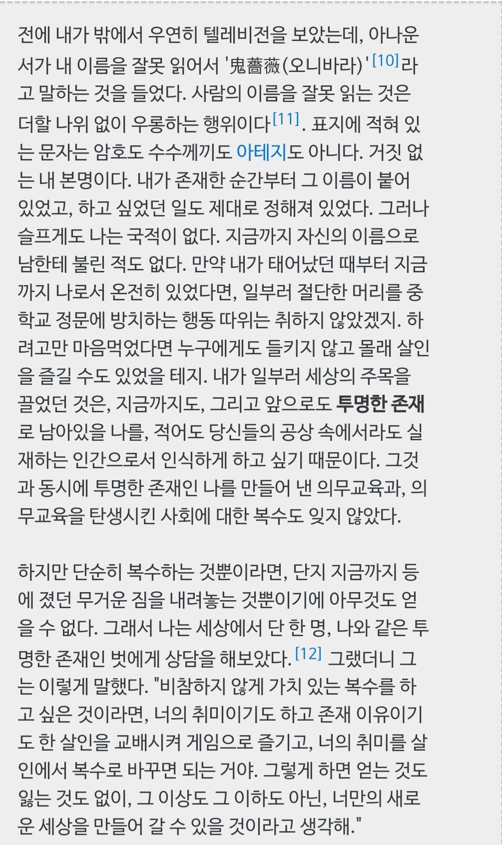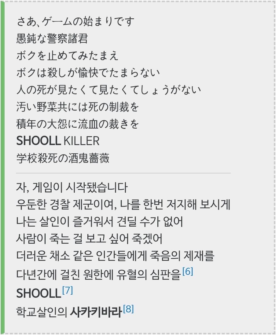 범인이 쓴 쪽지에 적힌 酒鬼薔薇(술 도깨비 장미)라는