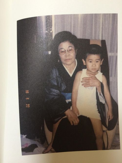 (6세 때의 아즈마. 그의 할머니한테 안겨 있다.)