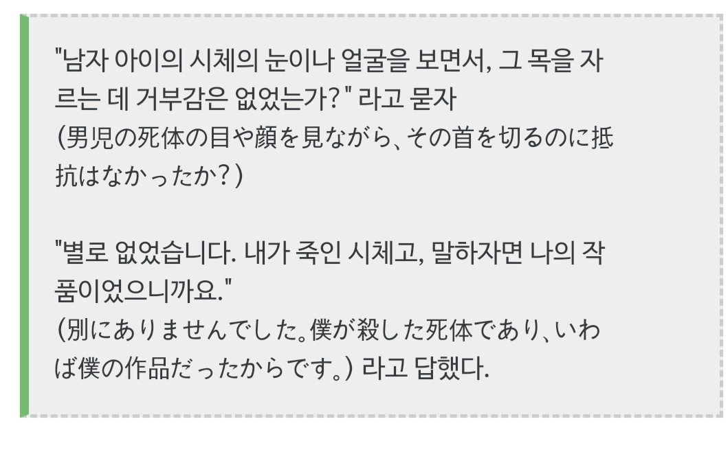 형사미성년자라는 이유로 처벌을 면하자 논란이 일었다. 그리고 사형수이자 신일본문학상 수상자인