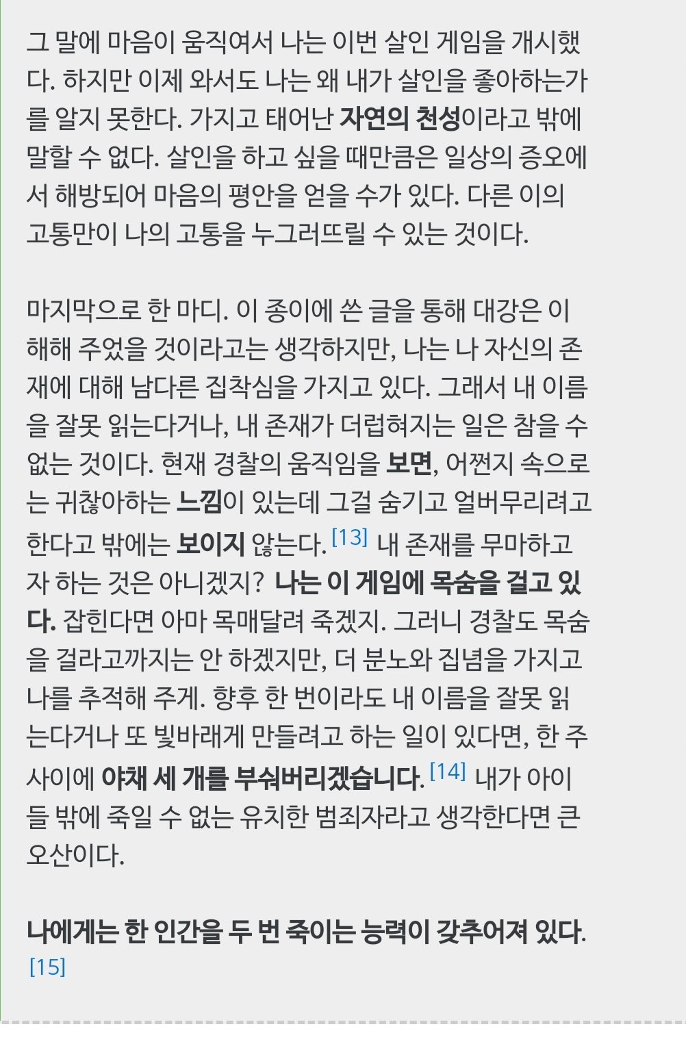 서술 등이 사이코패스로서의 자기중심성을 보여준다.