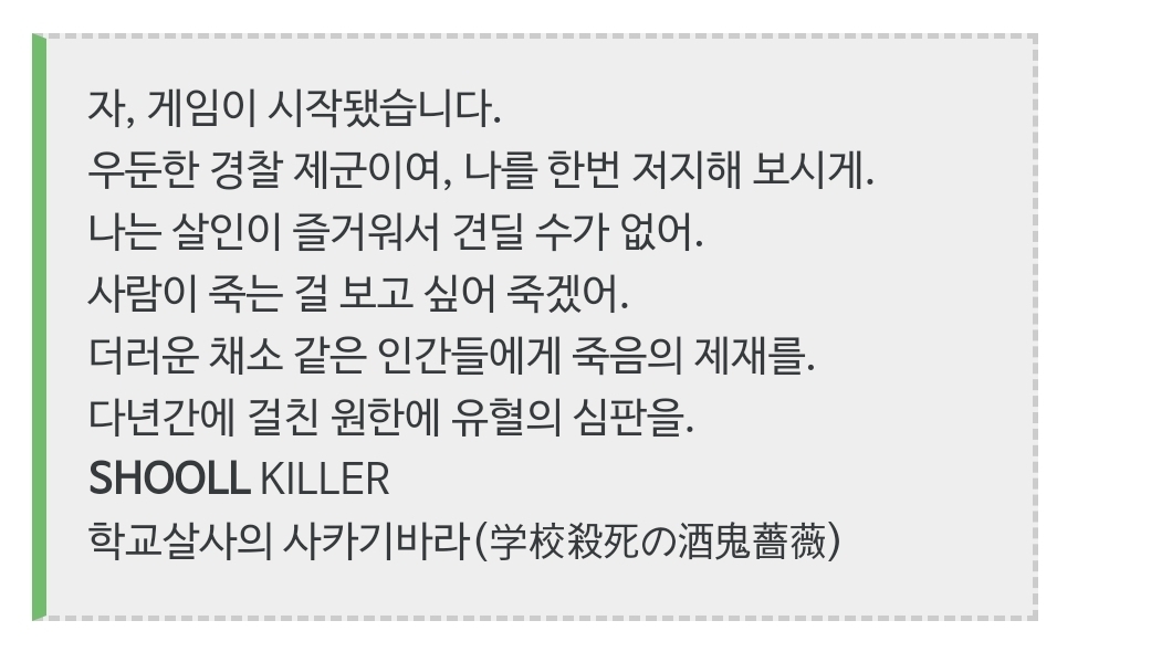 그리고 피해자의 입 안에서 한 통의 쪽지가 발견되었다.