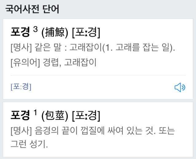 남자 성기의 귀두가 표피에 덮혀 있는 것을 가르켜 '포경(包莖)'이라고 하는데 '고래를 잡음'이라는 낱말도 발음이 같은 '포경(捕鯨)'이라고 합니다.