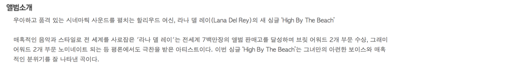 가사 보러가기 http://genius.com/Lana-del-rey-high-by-the-beach-lyrics/