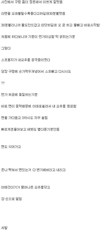 작성자패치피치 작성시간 15.11.26 존나안쓰러운느낌임.. 비위도좋지 컵라면으로....