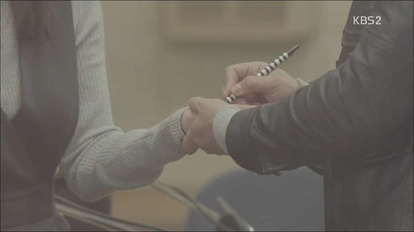 주은의 손에 뭔갈 적어주는 이지훈