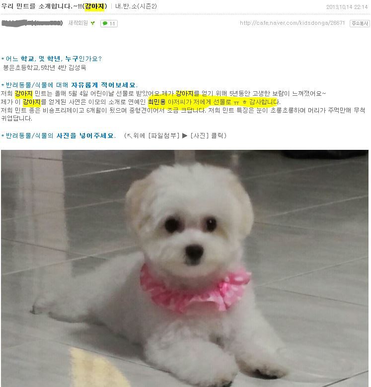 제가 이 강아지를 얻게 된 사연은 이모의 소개로 연예인 최민용 아저씨가 저에게 선물로 ㅠ ㅎ 감사합니다. (생략)