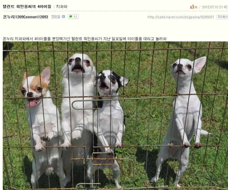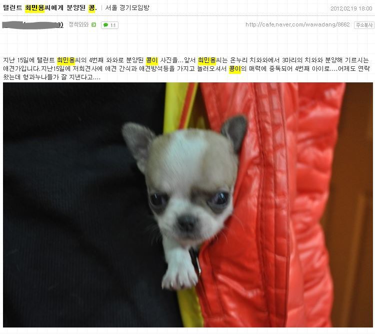 지난 15일 탤런트 최민용 씨의 4번째 와와로 분양된 콩이 사진을... 앞서 최민용 씨는 온누리 치와와에서 3마리의 치와와 분양해 기르시는 애견가입니다. (생략)