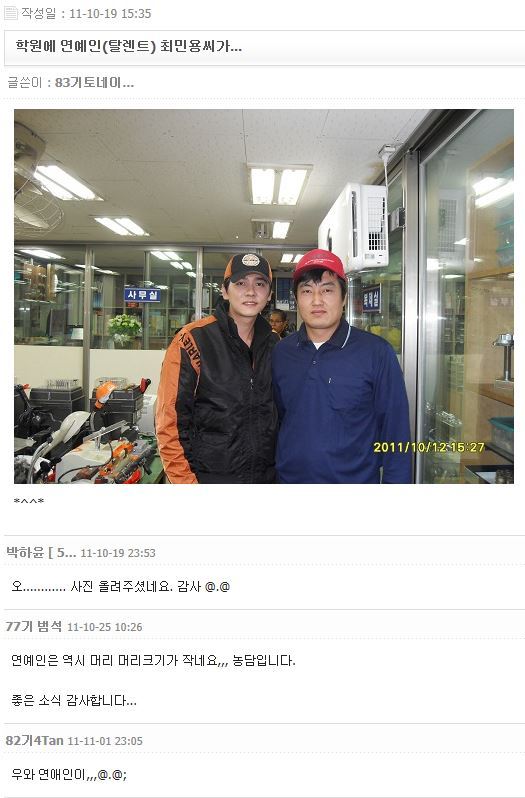 탤런트 최민용씨!! 그분이 인기 시트콤 '거침없이 하이킥'에도 주인공으로 출연하셨던 분이죠? 동문님들 최민용씨 실제로 보니까 어떻든가요? 키도 크고 남자답게 생기고.. 제가 학원에 재학중이었다면 저처럼 작은 사람하고는 엄청 비교 됐었겠네요~.~;;;