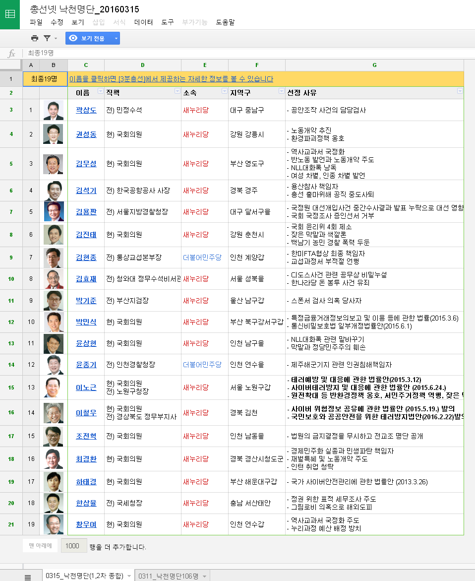 | 1 | 곽상도 | 전) 민정수석 | 새누리당 | 대구 중남구 | - 공안조작 사건의 담당검사 | |