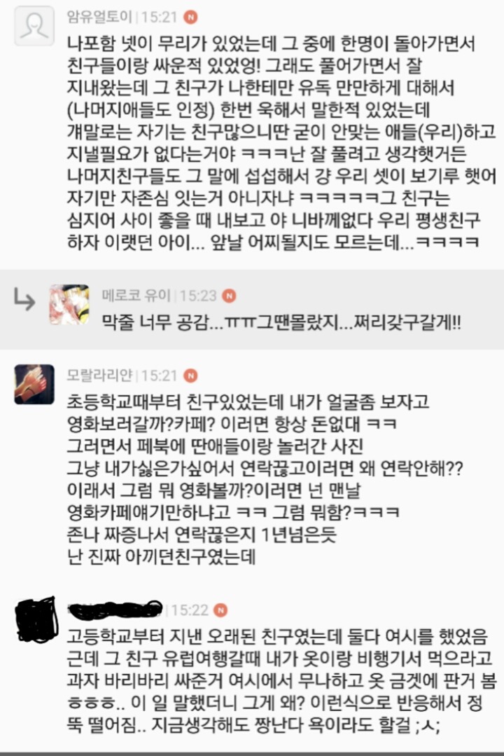 [흥미돋]진짜 친했다고 생각한 친구(혹은 친구들)랑 절교해본 여시들!!! 왜 연끊게 됐어??여기에 말해보자!