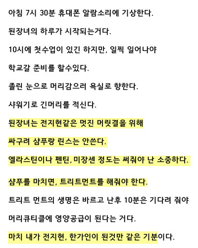 졸린 눈으로 머리감으러 욕실로 향한다.바가지로 덥수룩한 머리를 적신다.