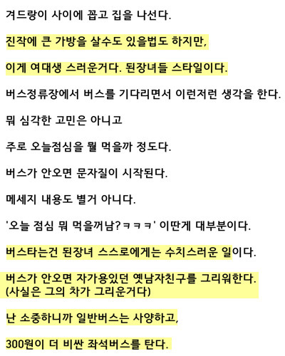 작성자우리집고양이홍보대사 작성시간 16.05.30 된장녀 되게 열심히살지않아? 10시수업인데 7시반에일어나고, 버스타는게 부끄럽다면서 택시안타고 버스타고 ... 운동도하고 자기관리도철저해...가방도 알바해서사고...