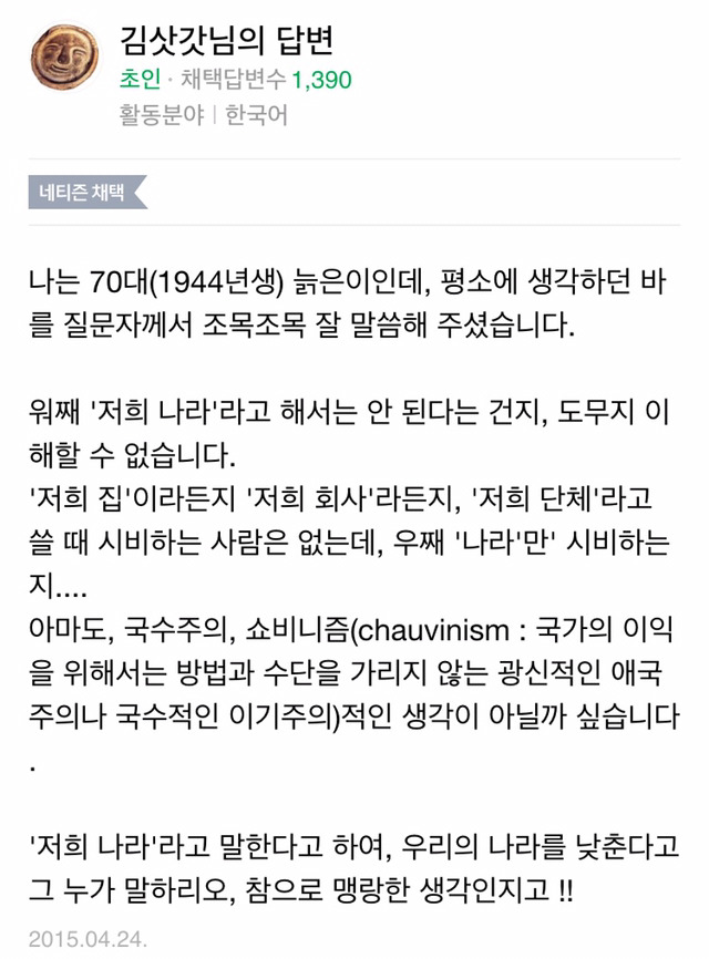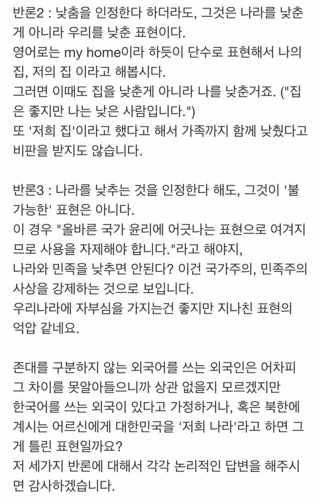 작성자먹고,놀고,사랑하고,연대하라 작성시간 16.07.17 근데 국가에 딱히 겸양 표현을 써야해? 그리고 저희나라는 대한민국 전체를 낯추어서 표현하는건데 왜 그래야해? 그냥 내 나라라고 해 굳이굳이 낯추고 싶으면 저의 나라 라고 해 혼자만 낯추지 왜 국가 전체를 낯춰야해?