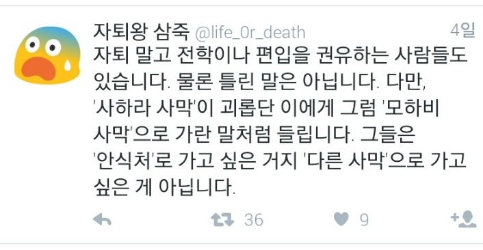 만약 주변에 따돌림으로 인한 자퇴를 고려하고 있는 학생이 있다면 전학 가' / '다른 학교 가면 달라'