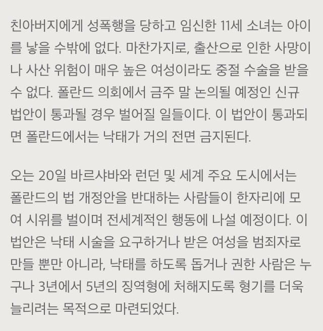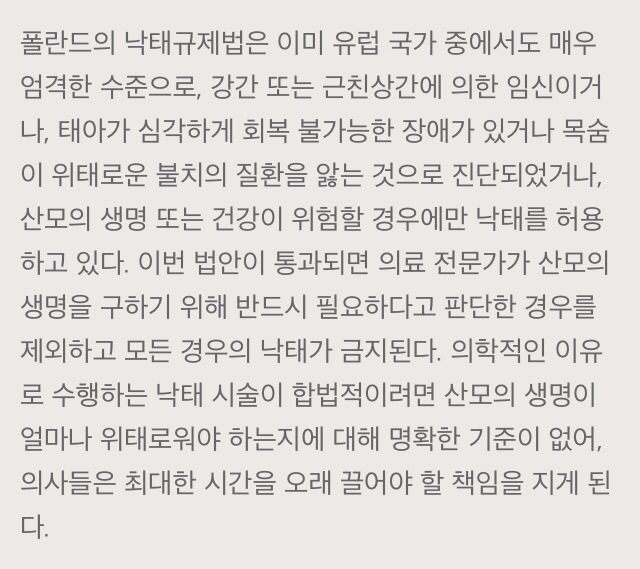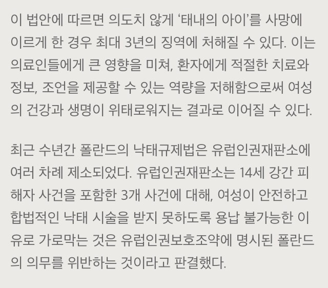 이미 폴란드는 한국처럼 완전 제한된 사유에만 낙태가 되는데 이법안에 따르면 낙태가 무조건 금지되서 강간당해서 가진아이도 낳아야되고 병걸려서 산모가 위험해도 낙태금지임 심지어 '의도치않게'아이를 죽여도3년 징역이 가능하다고함