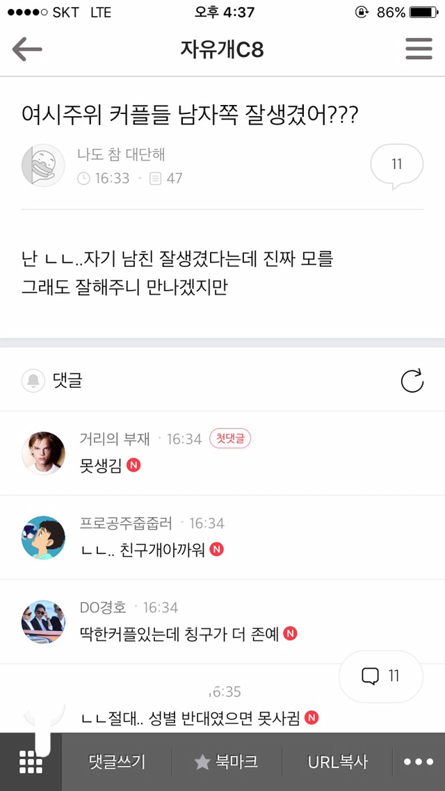 작성자루테의강 작성시간 16.10.20 음....내가 아는 10커플 중 10커플 다 남자 와꾸가 .....음..(욕욕 심한욕)