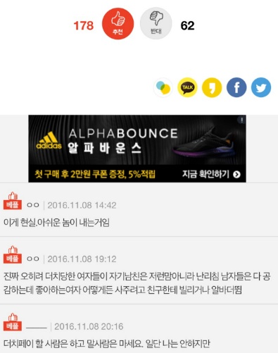 작성자끝올은진리 작성시간 16.11.25 사랑해서 나보다 그 사람이 더 행복했으면 해서 쓰는 돈에는 대가를 안바라잖아? 저 위의 글은 상대방을 눈치주게 만드는 행동에 대해 찝어 얘기하는 듯해. 여시들은 여시들만의 건강한 사랑법을 해. 나쁜거 아니야. 나도 저 글에 대해 찬성하지만 내가 더 좋아하면 더치페이보다 더 넘어선 무언가를 해줄 마음 가지고 있으니까 `ㅅ´ !!
