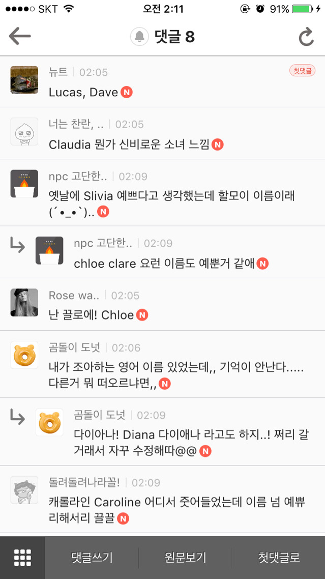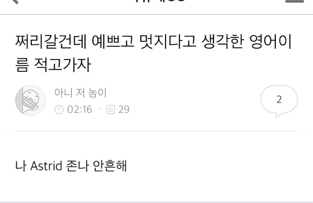 [스크랩] [흥미돋]헐 예쁘다/멋있다 라고 생각한 영어이름이 뭔가요 작성자슬픔에 빠졌다|작성시간16.11.30|조회수8,067 목록 댓글 221 글자크기 작게가 글자크기 크게가 출처 여성시대 아니 저 놈이 다음검색 스크랩 원문 : *여성시대* 차분한 20대들의 알흠다운 공간 현재 게시글 추가 기능 열기 북마크 공유하기 신고 센터로 신고 댓글 댓글 221 댓글쓰기 답글쓰기 댓글 리스트 작성자Mang했다9 | 작성시간 16.11.30 엠마 클로이 작성자#buenasuerte | 작성시간 16.11.30 로잔느 알렉산드라 작성자빛을 담은 별 | 작성시간 16.11.30 로이드 남자이름 뭔가좋아 작성자CathKidston | 작성시간 16.12.01 캔디스 스와네포엘!! 이름에서 향기나ㅋㅋㅋㅋ 작성자2017.상반기/166.48 | 작성시간 16.12.01 바네사 허진스! 댓글 전체보기