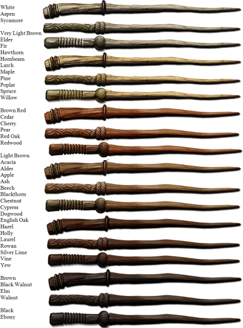 이 금빛의 나무는 훌륭한 마법의 힘을 지닌 지팡이를 만들어낸다. 배나무 지팡이는 관대하고 현명한 따뜻한 마음을 지닌 사람들에게 가장 잘 어울린다. 경험에 의하면 배나무 지팡이의 소지자들은 보통 인기가 많고 존경받는다. 나는 어둠의 마법사가 배나무 지팡이를 갖고 있는 것을 단 한 번도 보지 못했다. 배나무 지팡이는 가장 회복력이 좋은 지팡이 중 하나이다. 나는 종종 배나무 지팡이가 심지어 수년간 험하게 쓴 후에도 놀라우리만치 새 것의 모습을 지니고 있는 것을 종종 봐왔다.