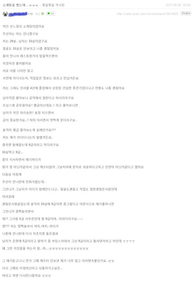 작성자가나다라바마 작성시간 17.01.07 먼가 한남 판타지인것같음ㅋㅋㅋㅋ 33살인데 제나이로 안보이는 외모와 알고보니 9급 아닌 5급.. 그리고 자신을 놓친것을 후회하는 여자.. ㅇㅅㅇ 애초에 주선자가 상대 직업이나 기본 사항 말안해준게 이상함. 삐빅 소설입니다