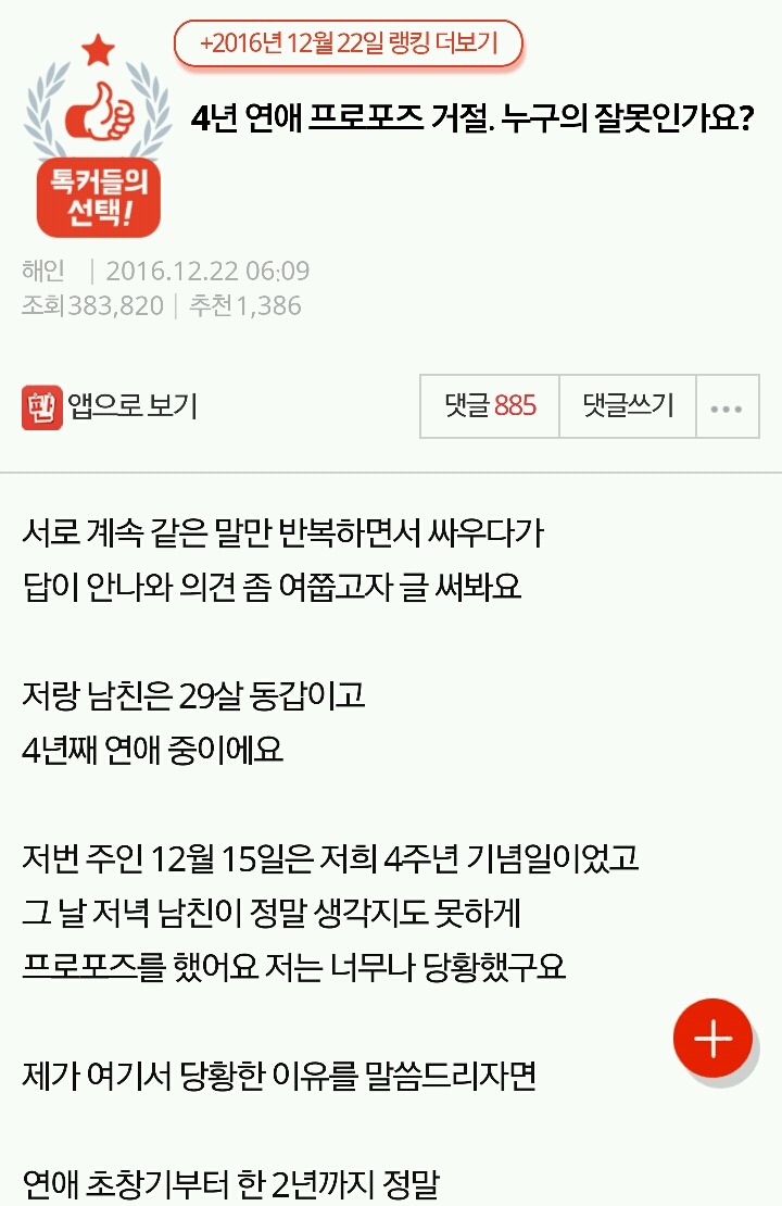 작성자메타몽ㅇ 작성시간 17.01.17 첫번째 베플이 정답이네.. 이 여자 놓치면 안되겠다 하는 마음이 아니고, 호구같고 만만하고 나가 놀기 편하다 싶으니까 프로포즈 한 거네.. 여자는 포기해서 그런 줄도 모르고....ㅉㅉ