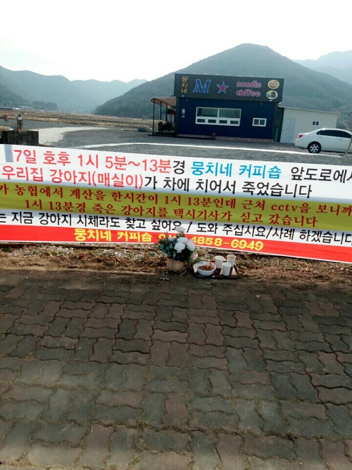 ★경남창녕군고암면우천리뭉치카페앞(창녕공고옆)★ 에서 혹시 매실이 사고 목격자는 꼭 연락주세요. 우리매실이를 개소주로 만들어놓고는 겨우 벌금이 다입니다.