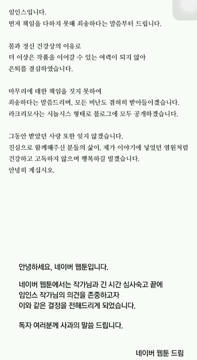 2015년 쯤이었나 라크리모사 10화정도 연재하던 중 돌연 은퇴한다며 공지가 올라왔었음.
