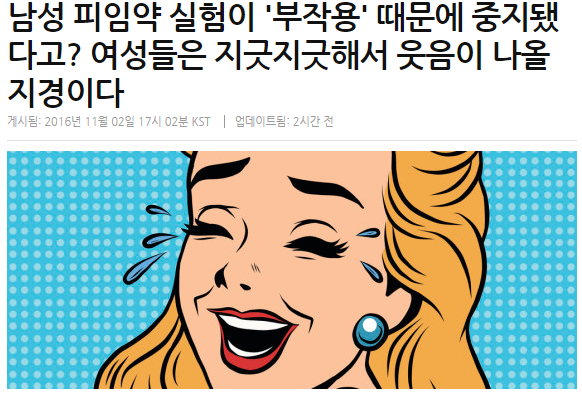 작성자버베벱베비베작성시간17.06.15조회수3,442 목록 댓글 15‘지극히 효과적인’ 남성 피임약 임상 실험이 부작용 때문에 중지되었다는 뉴스가 나오자 전세계 여성들은 배꼽이 빠져라 웃어댔다. 참여 남성들이 겪었다는 부작용은 우울증, 여드름, 급격한 기분 변화, 성욕 변화, 체중 증가 등이다. 에딘버러 대학교의 연구자들이 내분비학과 신진대사 저널에 발표한 소식이었다. 주사제인 이 약의 성공률은 96%로, 여성들이 복용하는 경구 피임약에 비해 조금 낮았다.