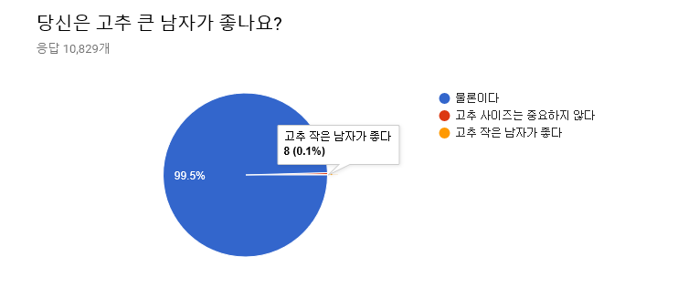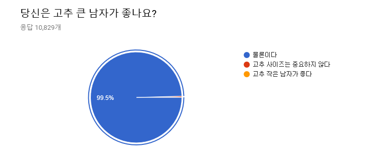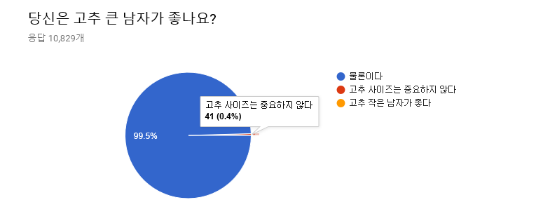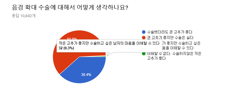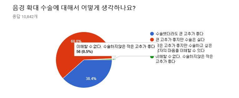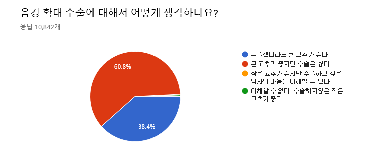 '의느님'의 손길이 닿았더라도 큰 성기를 선호하는 여자의 수 역시 적지 않았다. 하긴 요즘 기술이 발달해 감쪽같다고 하더라. 하지만 60% 이상의 여자들이 여전히 수술을 반대하고 있다는 것을 잊지 말자. 또한 수술하지 않은 작은 고추가 좋다는 대답도 56명(0.5%)에 달했다.