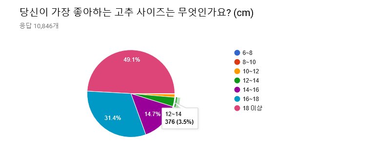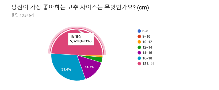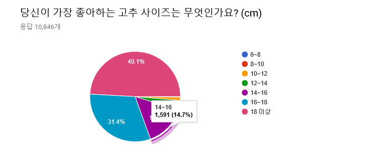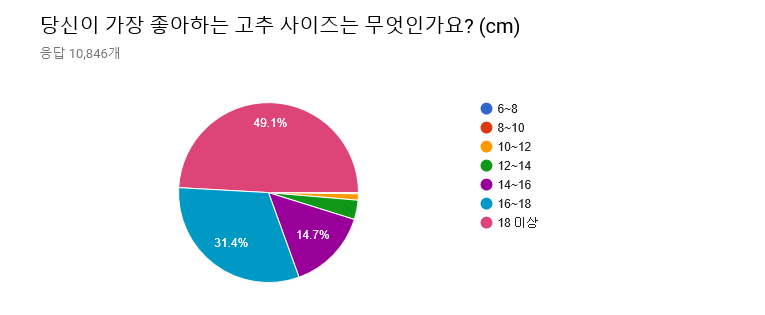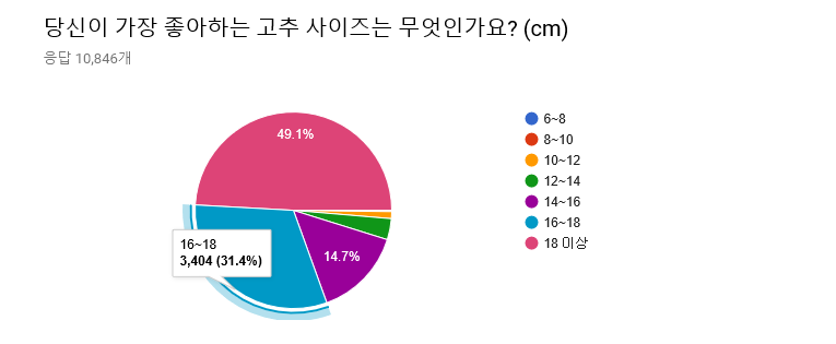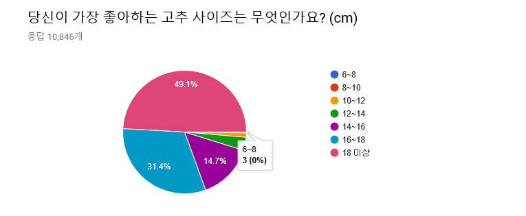 사이즈에 대해선, (당연하게도) 큰 사이즈일수록 좋다고 응답한 비율이 많았다. 특히나 18cm 이상의 성기가 좋다고 응답한 비율은 거의 절반에 다달았다. 그러나 (의외로) 6~8cm의 성기가 좋다고 응답한 사람도 응답자 10,846명 중 세 명이나 됐으며(이 사이즈의 남성들도 용기를 가져라! 삼천 명 중 하나는 당신을 좋아해줄테니!), 10~12cm의 성기는 124명(1.1%), 12~14cm의 성기도 376명(3.5%)나 되었다. 세계 평균이 13cm인 것을 감안할 때(출처: http://www.huffingtonpost.kr/2016/06/09/story_n_10369456.html), 약 4.6%나 되는 여성이 평균 혹은 그 이하의 성기도 선호한다고 응답한 것이다.
