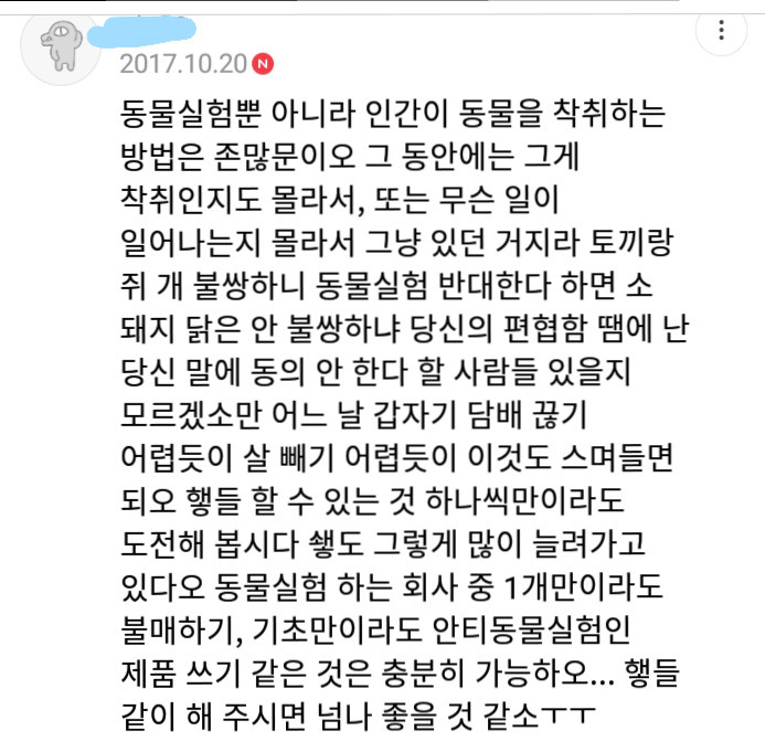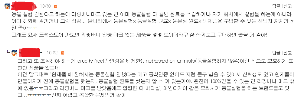 댓글로 동물 실험 하는 곳, 하지 않는 곳 정보 같이 공유했으면 좋겠소~~!!!