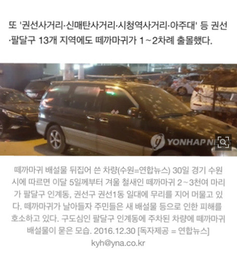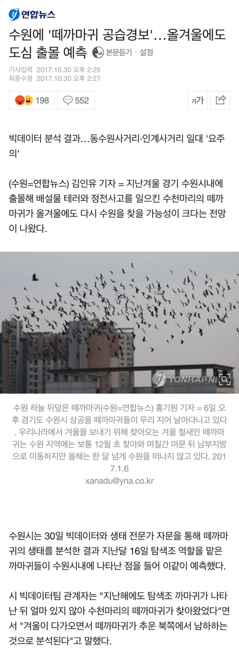 작성자아이스크림더쿠 작성시간 17.10.31 수원에서 30분 정도 떨어진 지역 사는데 우리 지역은 나 중딩?? 때부터 추워지기 시작하면 항상 까마귀떼 몰려왔었어! 그래서 중학교때는 하교하면서 매번 보고 고등학교때는 자습하면서 보고 그랬음...! 요즘엔 집에 잘 안있어서 우리동네 오는지 모르게따