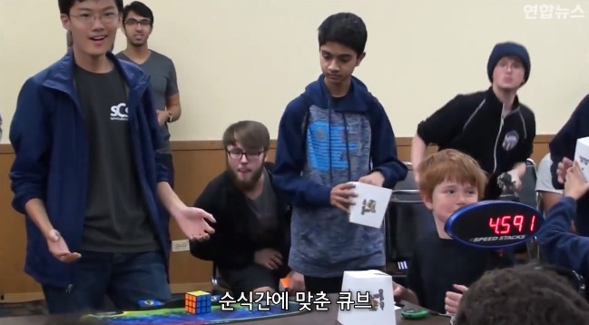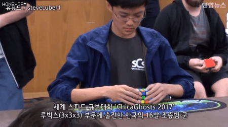 루빅스(3*3*3 큐브)부문에서 울나라 16살 남자애가 세계 신기록을 세워벌임(박수)(환호)