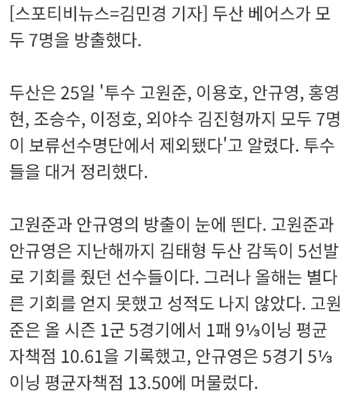 [여시뉴스데스크][프로야구][SPO 이슈] '투수 대거 정리' 두산, 최종 7명 방출(종합)(고원준, 안규영 외 5인) 작성자버터링 쿠키|작성시간17.11.25|조회수1,956 목록 댓글 7 글자크기 작게가 글자크기 크게가 출처 http://naver.me/5bbirYGj [SPO 이슈] '투수 대거 정리' 두산, 최종 7명 방출(종합)▲ 안규영 ⓒ 곽혜미 기자[스포티비뉴스=김민경 기자] 두산 베어스가 모두 7명을 방출했다.두산은 25일 '투수 고원준, 이용호, 안규영, 홍영현, 조승수, 이정호, 외야수 김진형까지 모두 7명이 보류선수명단에서 제외됐다'고 알렸다. 투수들을 대거 정리했다.고원준과 안규영의 방출이 눈에 띈다. 고원준과 안규영은 지난해까지...sports.news.naver.com 전문 출처로 다음검색 현재 게시글 추가 기능 열기 북마크 공유하기 신고 센터로 신고 댓글 댓글 7 댓글쓰기 답글쓰기 댓글 리스트 작성자사랑과존경 | 작성시간 17.11.25 오 고원준? 작성자호주댁 | 작성시간 17.11.25 헐 고원준 안규영.. 작성자여행하는삶 | 작성시간 17.11.25 더내보내 더더 작성자후장따리후장따 | 작성시간 17.11.25 문읍읍부터 정리하라고~! 작성자Winona Ryder | 작성시간 17.11.25 진야곱 방출 plz 댓글 전체보기