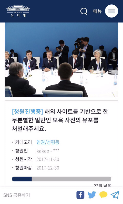 청와대 국민소통 광장 > 국민청원해외 사이트를 기반으로 한 무분별한 일반인 모욕 사진의 유포를 처벌해주세요.www1.president.go.kr