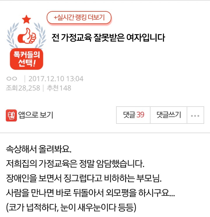 장애인을 보면서 징그럽다고 비하하는 부모님.