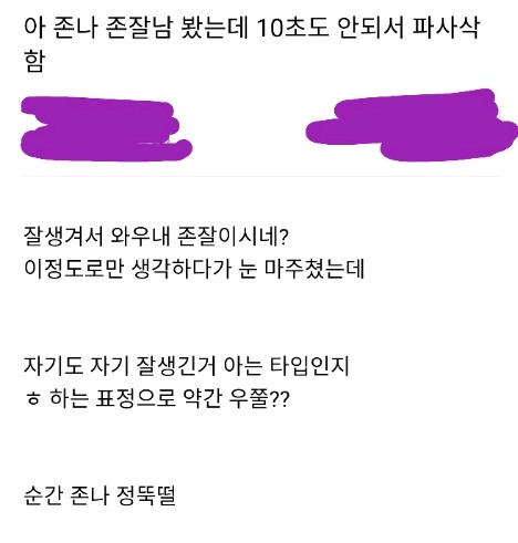 소문만 듣다가 직접 봐서 '오 쟤구나' 이러면서 별ㄹㅎ 쳐다보지도않았고 그냥 지나갔는데 냄져새끼 존나 의식쩔어;;;;;;;; 누가보면 연예인인줄 알겠음 아주;;존나 같잖았음 -