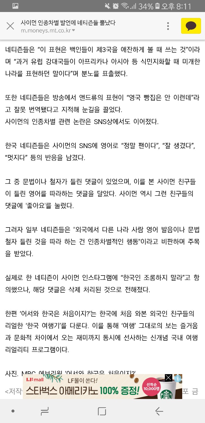 실제로 한 네티즌이 사이먼 인스타그램에 “한국인 조롱하지 말라”고 항의했으나, 해당 댓글은 삭제 처리된 것으로 전해졌다.