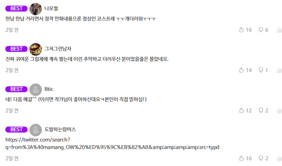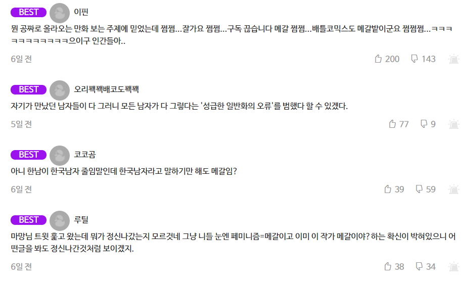 그림체도 귀여우시고 만화도 재밌어서 가끔 몰아보려고 오늘 배틀코믹스 사이트 들어갔는데 최신화에 댓글이 1500개가 넘게 달려있는거;; 보통200 개 이상인데 왜이렇게 많지? 뭔일 이지 하고 들어가니까 작가님 메갈이였음? 배틀코믹스에 문의 넣을꺼임 찡찡 거리는 사람이 한둘이 아닌거야