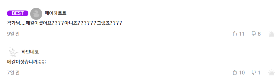 저거를 시작으로 최신화에 트위터주소가 달리면서 댓글로 메갈이냐 작가 짤라라 하는 댓글이 달렸더라고