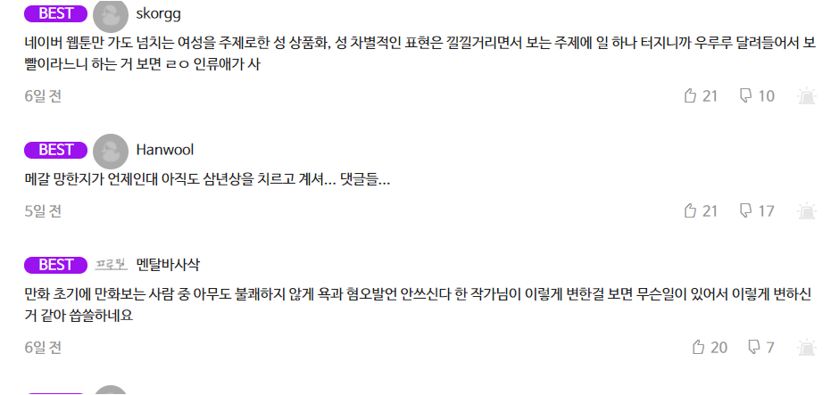 정말 네이버만봐도 여자를 성상품화하고 문제가 될 수 있는 발언을 한 작가도 오조억명인데